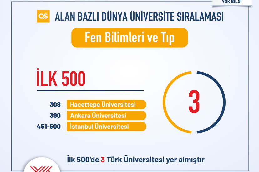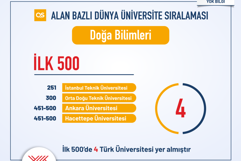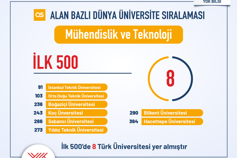 Ankara Üniversitesi, Bilkent Üniversitesi, Boğaziçi Üniversitesi, Gazi Üniversitesi, Hacettepe Üniversitesi, İstanbul Teknik Üniversitesi (İTÜ), İstanbul Üniversitesi (İÜ), Koç Üniversitesi, Orta Doğu Teknik Üniversitesi (ODTÜ), Sabancı Üniversitesi ve Yıldız Teknik Üniversitesi (YTÜ) farklı alanlarda ilk 500’de yer alan Türkiye üniversiteleri oldu.