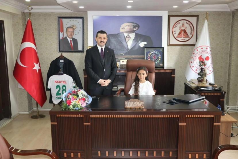 Kaymakam Coşkun makam koltuğunu Gazi İlkokulu öğrencileri Ayaz Başboğa ve İlknur Bahar Akkoyun’a devretti. Küçük Kaymakamlar makamda görev yaparak düşüncelerini, taleplerini ve geleceğe dair hayallerini paylaşırken, ilgili kurumlara yönelik talimatlarını da iletti. Çocukların sergilediği özgüven ve sorumluluk bilinci programa ayrı bir anlam kattı. Çocuklarla yakından ilgilenen Kaymakam Coşkun yaptığı konuşmada, çocukların ülkemizin geleceği olduğunu vurgulayarak; sevgi, eğitim ve güven ortamında yetişmelerinin önemine değindi.