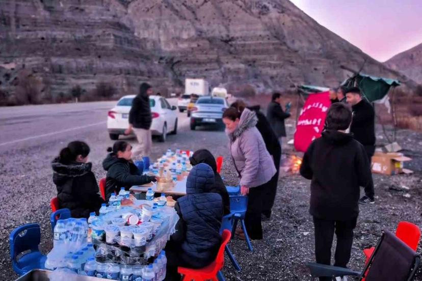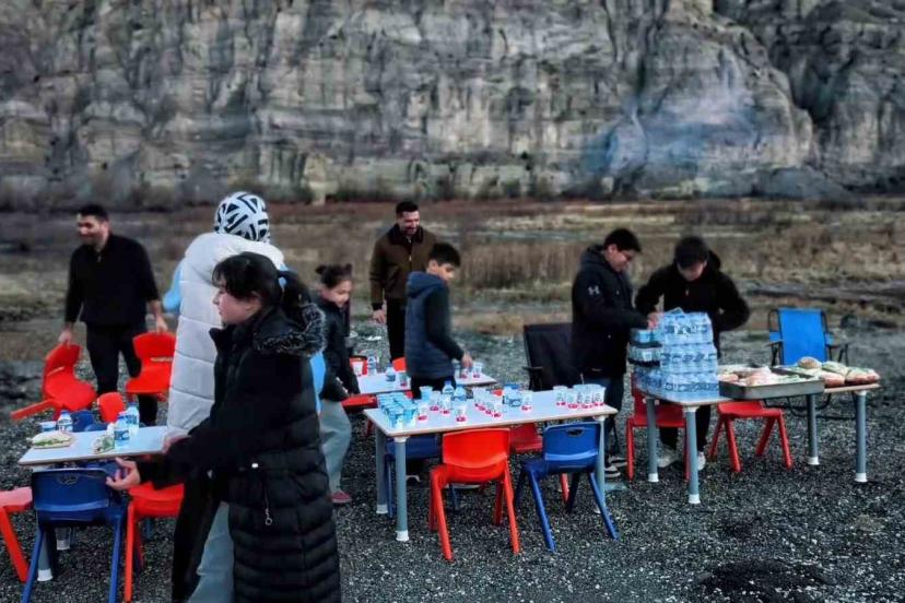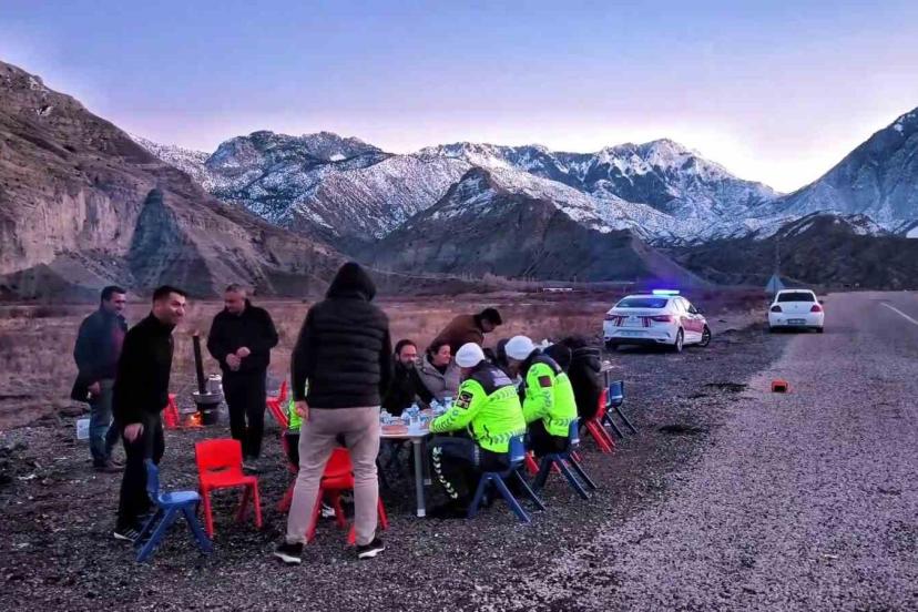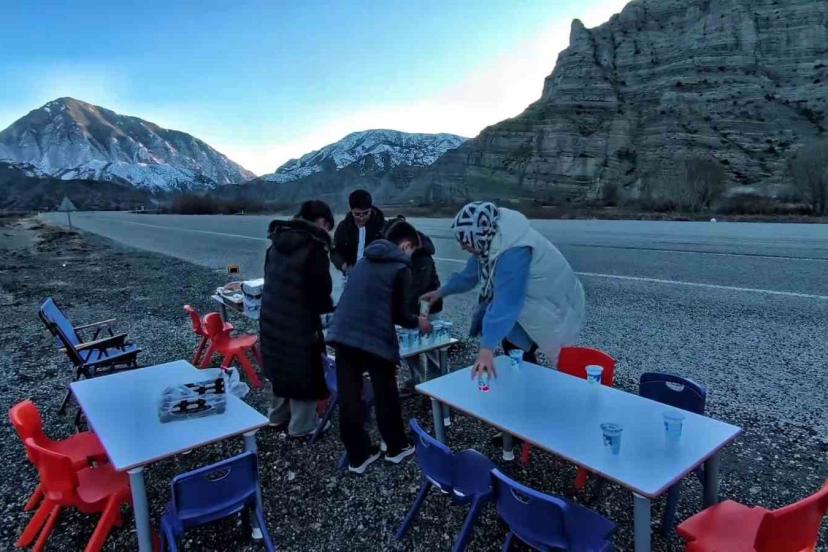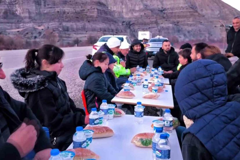 Erzurum-Artvin kara yolunda kurulan iftar sofrasında öğrenciler ve öğretmenler, evine yetişemeyen sürücülere sandviç, su ve ayran ikram ederek Ramazan’ın paylaşma ruhunu yaşattı.