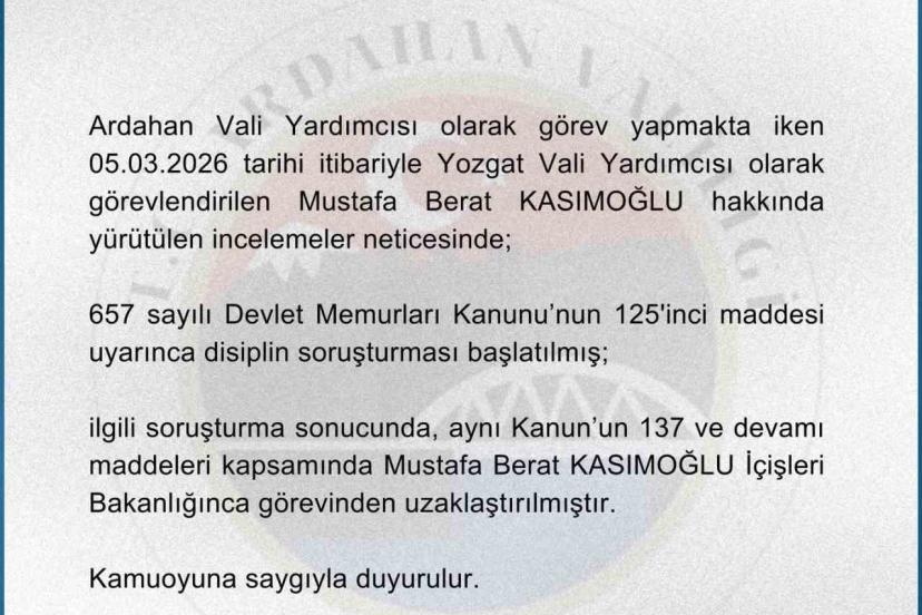 Ardahan Valiliği’nden yapılan yazılı açıklamada, ’’Ardahan Vali Yardımcısı olarak görev yapmakta iken 05.03.2026 tarihi itibariyle Yozgat Vali Yardımcısı olarak görevlendirilen Mustafa Berat Kasımoğlu hakkında yürütülen incelemeler neticesinde; 657 sayılı Devlet Memurları Kanunu’nun 125’inci maddesi uyarınca disiplin soruşturması başlatılmış; ilgili soruşturma sonucunda, aynı Kanun’un 137 ve devamı maddeleri kapsamında Mustafa Berat Kasımoğlu İçişleri Bakanlığınca görevinden uzaklaştırılmıştır’’ ifadelerine yer verildi.