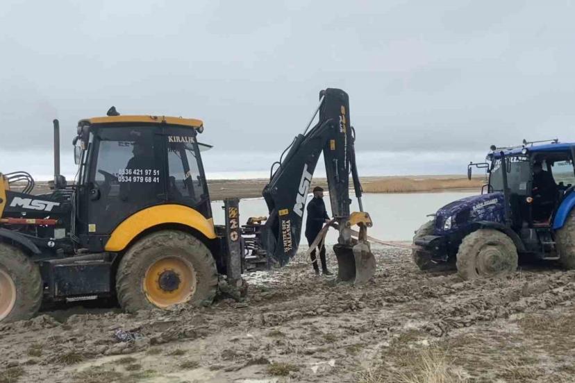 Van Gölü sahilinde çamura saplanan traktör kepçe ile kurtarıldı