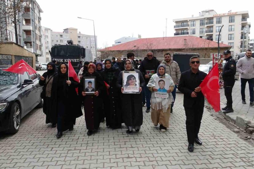 Van’da terör örgütü PKK tarafından çocukları dağa kaçırılan ailelerin başlattığı evlat nöbeti devam ediyor. Ellerindeki Türk bayraklarıyla DEM Parti İl Başkanlığı önüne kadar sessiz bir şekilde yürüyen ve tek amaçlarının evlatlarına kavuşmak olduğunu belirten aileler, çocuklarına ‘teslim olun’ çağrısında bulundu.